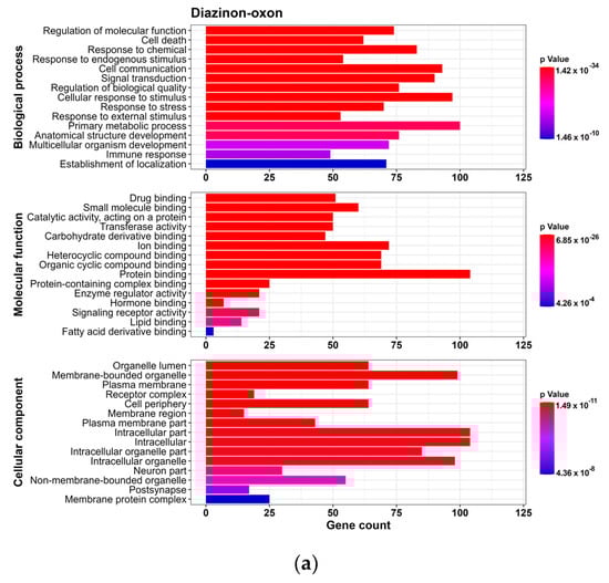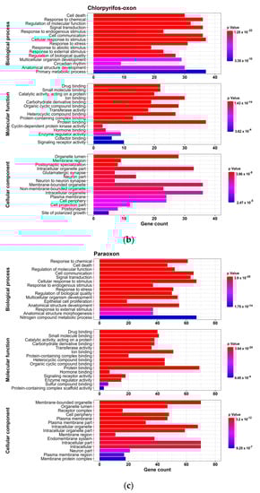 Results of Gene Ontology analyses for targets of Neurodevelopmental Toxicity induced by organophosphates (OPs) (a) diazinon-oxon, (b) chlorpyrifos oxon, and (c) paraoxon. The top 15 processes for Biological Process, Molecular Function, and Cellular Component for each OP were selected based on the p-value. The x-axis indicates the number of genes related to each process. The colors change from red to blue, indicating a decrease in the p-value.