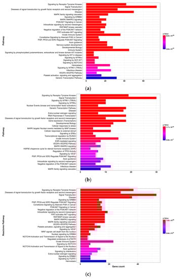 Results of reactome pathway analyses for targets of organophosphate-induced developmental neurotoxicity (a) diazinon-oxon, (b) chlorpyrifos oxon, and (c) paraoxon. The top 30 pathways based on p-value are shown. The x-axis represents the number of genes associated with each pathway. The colors transition from red to blue, indicating a decrease in p-value.