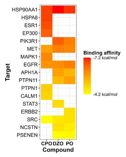 We used molecular docking to predict the interactions between each OP and their respective hub nodes (presented in Table 2). A lower binding energy between the compound and the target indicates a higher affinity. The binding energies between the OPs and macromolecules ranged from −7.2 to −4.2 kcal/mol (Figure 5). Among the targets shared by the OPs, HSP90AA1 had the lowest binding energy with the OPs, followed by MET, EGFR, and SRC.