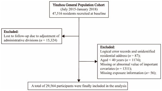 From July 2015 to January 2018, a total of 47,516 individuals from ten towns in Yinzhou district of Ningbo, China, were selected for interviews and physical examination. We excluded 15,324 individuals lost to follow-up due to adjustment of administrative divisions. Individuals aged ≥40 years with complete data on covariates, addresses, and exposures voluntarily enrolled in this cohort (Figure 1). Each participant was followed up to death or 30 September 2021, whichever came first. The Institutional Review Board of Zhejiang University School of Medicine ethically approved our study. All participants offered informed consent at the commencement of the study.