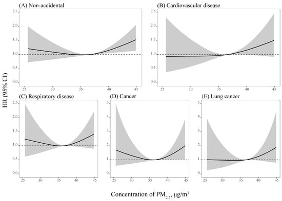 An explicit concentration–response function based on local population facilitates the formulation and revision of air-quality standards and environmental policies [28]. Studies derived from Europe and North America with lower PM2.5 exposure (<30 μg/m3) found long-term exposure to PM2.5 linearly increased mortality [44,58,59]. However, studies covering a wider range of PM2.5 concentrations in China detected that this association might be nonlinear, which was mainly embodied in the range of 30–60 μg/m3 concentrations [22,24,28,30]. In our study, long-term exposure to PM2.5 was linearly associated with non-accidental and cardiovascular disease mortality in the range of 25.57–45.40 μg/m3, and we assumed that this concentration range was too narrow to detect potential nonlinear associations. Thus, future cohort studies conducted in countries and areas with a wider range of PM2.5 concentrations are warranted to reveal the concentration–response function comprehensively.