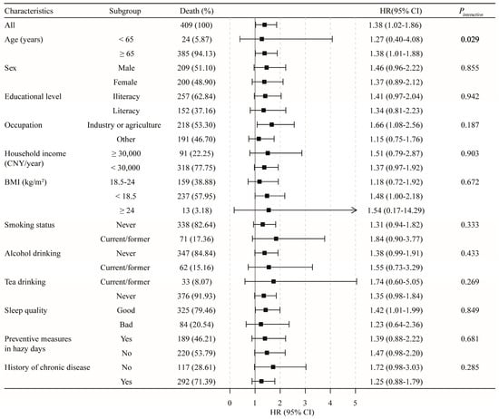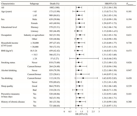 We also conducted stratified analysis to investigate effect modification by the following variables: age at enrollment (<65 years vs. ≥65 years); sex (male vs. female); educational level (illiteracy vs. literacy); occupation (industry or agriculture vs. other); household income (<30,000 CNY vs. ≥30,000 CNY); BMI (18.5–24 kg/m2 vs. <18.5 kg/m2 vs. ≥24 kg/m2); smoking status (never vs. current/former); alcohol drinking (never vs. current/former); tea drinking (never vs. current/former); sleep quality (good vs. bad); preventive measures on hazy days (yes vs. no); and comorbidities (yes vs. no). Multiplicative interaction terms added in model 4 were used to examine the potential interactions.