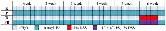 The animals were divided into 4 groups of 8 mice each (Figure 1): K—the control group, in which, throughout the experiment, the mice received distilled water; P—the model of MP consumption; D—the model of acute DSS colitis; PD—the model of acute DSS colitis against the background of MP consumption. The drinking water of the animals in groups P and PD was substituted for 6 weeks with a suspension of polystyrene (PS) microparticles of 5 μm in diameter in distilled water at a concentration of 10 mg/L (79633, Sigma-Aldrich, St. Louis, MO, USA). The plastic type, particle size, and slurry concentration were consistent with previous studies [,]. Glass drinking vessels were used to avoid foreign plastic particles entering the water. The average weight of the mice was 22 g, the animals drank about 5 mL of the suspension per day, respectively, and the MP dose was about 2.3 mg/kg/day. Senathirajah K. et al. (2021) estimated that globally, on average, humans may ingest 0.1–5 g of MPs weekly through various exposure pathways, corresponding to approximately 0.2–10 mg/kg/day []. For the induction of acute colitis in the animals of groups D and PD, for 5 days (from days 36 to 40 of the experiment), dextran sulfate sodium (DSS) with a molecular weight of 40 kDa (AppliChem) was added to the drinking vessels with a final concentration of 1%. For 5 days, each animal consumed approximately 0.25 g of DSS []. The animals were taken out of the experiment on the 43rd day via the method of cervical dislocation under ether anesthesia.