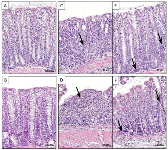 Distal colon of control mice (A), MP-treated mice (B), and mice with acute colitis that did not receive (C,E) and did receive MPs (D,F). In figures (C) and (D)—ulcers; (E,F)—inflammation (arrows). Hematoxylin and eosin staining. In control (A) and MP-treated (B) mice, mucus was normal: epi-thelium was preserved throughout the mucosa, the crypts were deep, and there were a lot of goblet cells and a small amount of immune cells. In mice with colitis which did not receive (C,E) and did receive MPs (D,F), there were acute ulcers and inflammation areas (arrows) with reduced goblet cell numbers that were infiltrated with neutrophils and lymphocytes.