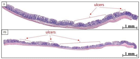 Ulcerative inflammatory changes in the distal colon of mice with acute colitis that did not receive (D) and did receive MPs (PD). Ulcers—arrows.