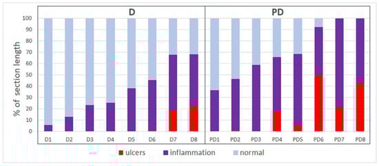 To assess the prevalence of ulcers and inflammation, longitudinal sections of the distal intestine were scanned along the entire length at a magnification of 100. The total length of the section along the lamina muscularis mucosa and the length of its sections, along which ulcers and inflammatory infiltrates occurred, were measured. The percentage of the length of the intestine with ulcers and inflammation was calculated.