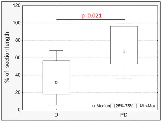 The prevalence of the ulcerative inflammatory process varied greatly between animals with colitis, even within the same group (Figure 3 and Figure 4); however, in the group of animals treated with MPs, the prevalence of the ulcerative inflammatory process was statistically significantly higher (Figure 5).