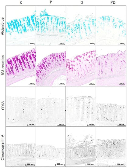 Distal colon of mice in the control group (K), consuming microplastics (P) with acute DSS-induced colitis (D) and with acute colitis against the background of microplastic consumption (PD), stained with alcian blue at pH 1.0 (highly sulfated mucins), the PAS reaction (neutral mucins), immunofluorescent staining with antibodies to CD68 (macrophages) and chromogranin A (endocrine cells). Photographs of sections with immunofluorescent staining are discolored and inverted for better contrast.