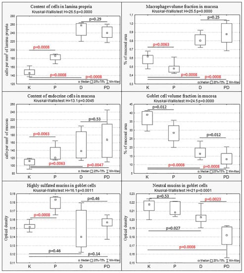 Changes in the mucosa of the distal colon with MP consumption (P), acute colitis (D), and acute colitis with MP consumption (PD) compared with the control group (K). Kruskal–Wallis test, post hoc comparisons—Mann–Whitney U-test with Bonferroni correction, statistically significant differences p < 0.0085.