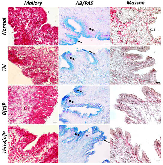 Cross section of mantle of M. galloprovincialis (40×, scale bar: 10 µm). Mallory trichrome and Masson trichrome morphological staining revealed a homogeneous, well-organized connective tissue (C) and an epithelium with columnar (CE) and cuboidal (CuE) cells in control animals. AB/PAS histochemical staining revealed the presence of acidic (arrow) and neutral (double arrow) mucopolysaccharides. In groups exposed to pollutants, the epithelium was more disorganized, with looser connective tissue and an overproduction of acidic mucopolysaccharides.
