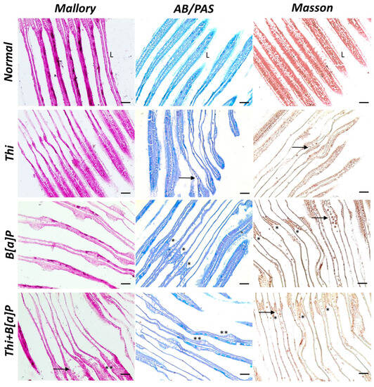 Cross section of gills of M. galloprovincialis (40×, scale bar: 10 µm). Control specimens showed well-organized, linear gills with homogeneous lamellae (L) and compact epithelium. In the exposed groups, the lamellae appear disorganized, and the epithelial tissue appear inhomogeneous. Fusion of lamellae (*) with hyperplastic and hypertrophic cells (**) is also evident in some places. In addition, aggregates of hemocytes are evident in the pollutant-exposed groups (arrow).