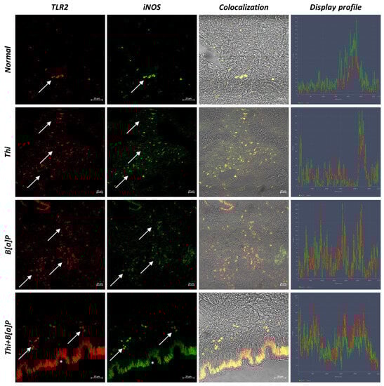 Cross section of mantle of M. galloprovincialis (40×, scale bar: 20 µm). Confocal microscopy analysis shows hemocytes positive for TLR2 (red) and iNOS (green) (arrow). Not all hemocytes colocalize for the antibodies tested. Colocalized hemocytes can be seen in yellow. In groups exposed to pollutants, an increase in the number of immunoreactive hemocytes is observed. Strongly antibody-reactive epithelial cells are observed in the exposed groups (*). Use of the “display profile” function confirms the colocalization of antibodies.