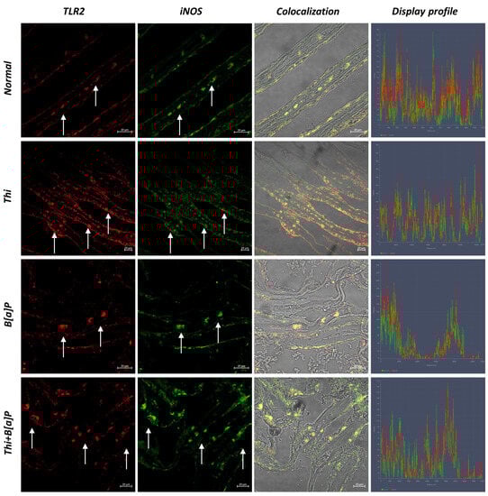 Confocal microscopic investigation revealed hemocytes immunoreactive to TLR2 and iNOS in all groups. Moreover, hemocytes immunoreactive to these molecules, which colocalize conspicuously, are visible in both the epithelium and subepithelium. However, there is a noticeable increase in the number of hemocytes in the exposed groups, especially in the one exposed to both pollutants. Furthermore, markedly positive epithelial cells to both antibodies are noted, especially in the group exposed to B[a]P and thiacloprid. Interestingly, not all hemocytes colocalized for the antibodies tested, suggesting a difference in the function of these cells (Figure 3 and Figure 4).