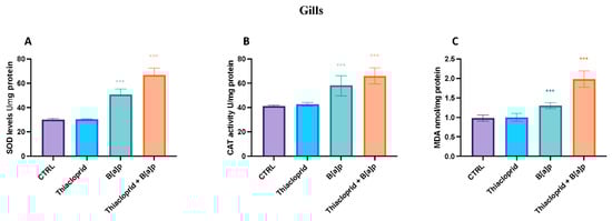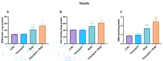 SOD, CAT, and MDA activity was not found to be considerably impacted by the thiacloprid 4.5 μg/L−1 exposure group in the current investigation (Figure 5 and Figure 6). On the contrary, the B[a]P 1 μg/L−1 group presented an increase in SOD, CAT, and MDA activity in both mantle and gills after 7 days of exposition compared to the control group (Figure 5 and Figure 6). Finally, the thiacloprid 4.5 μg/L−1 and B[a]P 1 μg/L−1 mixture group showed a significant rise in the activity of SOD and CAT in the both gills and mantle compared to the single-exposure groups and the control (Figure 5 and Figure 6).