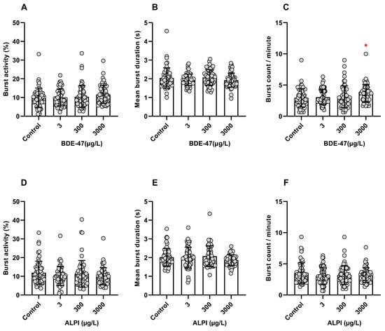 Zebrafish embryos exposed to BDE-47 did not show significantly different burst activity (%) (H = 5.066; p > 0.05) or mean burst duration (s) (H = 4.870; p > 0.05). In contrast, the burst count per minute increased significantly at the highest tested concentration of 3000 µg/L BDE-47 when compared to the control (0.1% DMSO, v/v) (H = 9.911; p < 0.05) (Figure 1A–C). Embryos exposed to ALPI did not present significant differences in any of the analyzed parameters, namely burst activity (%) (H = 2.503; p > 0.05), mean burst duration (s) (H = 3.335; p > 0.05), and burst count per minute (H = 1.997; p > 0.05), when compared to the control (embryo medium) (Figure 1D–F).