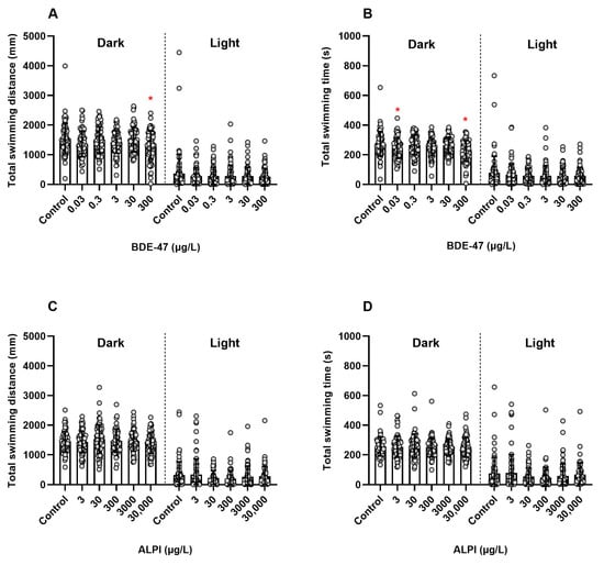 BDE-47 significantly decreased the total swimming distance (mm) (Dark I + Dark II: (F (5, 426) = 2.838, p < 0.05)) and total swimming time (s) (Dark I + Dark II: (F (5, 426) = 5.019, p < 0.05)) of larvae exposed to 300 µg/L BDE-47 when compared to the control (0.01% DMSO, v/v) (Figure 2A,B). Furthermore, the total swimming time (s) decreased significantly at 0.03 µg/L BDE-47 (Figure 2B). On the other hand, zebrafish larvae exposed to ALPI did not show significantly different total swimming distance (mm) or total swimming time (s) (Dark I + Dark II: F (5, 418) = 0.9575, p > 0.05; Light I + Light II: H = 7.499, p > 0.05; and Dark I + Dark II: F (5, 418) = 0.3319, p > 0.05; Light I + Light II: H = 9.088, p > 0.05; respectively) when compared to the control (embryo medium), as presented in Figure 2C,D.