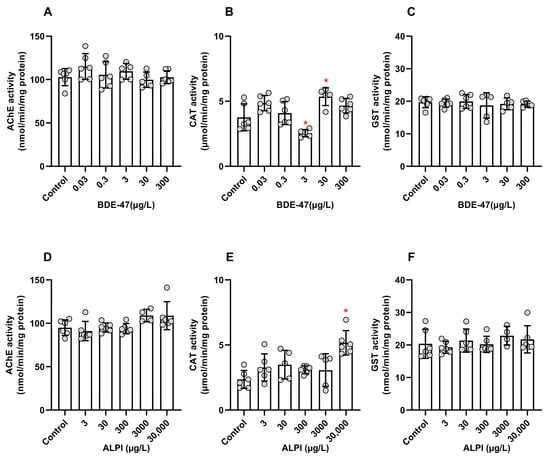 BDE-47 and ALPI significantly altered the CAT activity. For the other enzymatic activities analyzed here, the effects of the flame retardants did not differ significantly. For BDE-47, the AChE activity was not significantly altered (F (5, 28) = 1.330; p > 0.05); the CAT activity decreased for 3 and increased for 30 µg/L (F (5, 28) = 9.656; p < 0.05); and the GST activity remained unchanged (F (5, 27) = 0.2295; p > 0.05) when compared to the control (0.01% DMSO, v/v) (Figure 3A–C). For ALPI, the AChE activity did not change (F (5, 28) = 3.371); the CAT activity increased at the highest tested concentration of 30,000 µg/L (F (5, 28) = 6.218; p < 0.05); and there were no significant effects on the GST activity (F (5, 28) = 0.7026; p > 0.05) (Figure 3D–F).