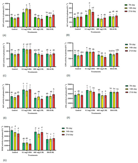 Changes in the activity of enzymes in the plasma of fish are illustrated in Figure 1. The findings indicated that silymarin did not have a significant impact on the activities of AST, ALT, GGT, LDH, ALP, CPK, and BChE in fish. The activities of AST, GGT, LDH, and ALP were significantly increased in the plasma of fish exposed to diazinon. Results displayed that administration of silymarin could restore AST, GGT, LDH, and ALP activities in fish exposed to diazinon (Figure 1). Although no significant change was observed in ALT activity in fish exposed to diazinon compared with the control group on the 7th day of the experiment, its activity was significantly increased on the 14th and 21st days of the trial. Feeding fish with silymarin restored ALT activity in fish exposed to diazinon (Figure 1). LDH and CPK activities in the treated fish with diazinon were significantly higher than the control group. Moreover, administration of silymarin could not restore LDH and CPK activities in fish exposed to diazinon (Figure 1). Results indicated a significant decrease in BChE activity in fish exposed to diazinon. Although administration of silymarin improved BChE activity in fish exposed to diazinon, the activity of BChE was not restored to the normal range (Figure 1).