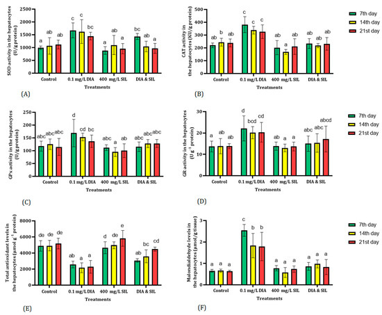 Results suggested that exposure to diazinon resulted in decreased total antioxidant levels in the hepatocytes of fish compared to a control group. Antioxidants are important molecules that help protect cells from oxidative damage caused by free radicals [55]. The results indicated that feeding fish with silymarin did not restore the total antioxidant capacity on the 7th and 14th days of the experiment. However, on the 21st day, there was a significant increase in total antioxidant levels in the fish exposed to both diazinon and silymarin compared to the control group. These findings suggested that silymarin supplementation might have a delayed restorative effect on the total antioxidant capacity in fish exposed to diazinon. It is worth noting that the increase in total antioxidant levels on the 21st day of the experiment indicated a potential protective effect of silymarin against oxidative stress induced by diazinon exposure. Kim et al. [56] found that the total antioxidant capacity in the hepatocytes of olive flounder (Paralichthys olivaceus) was enhanced by feeding them a diet supplemented with micelle silymarin.