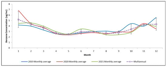 Cold months tend to reach higher concentrations, compared to warm ones. In 2020, there was a slight reduction between April and July compared to the other two years potentially related to the lockdown restrictions. Based on the aggregated monthly averages, the lowest concentration of benzene was in May (~3 µg/m3), while the highest was in January (~5 µg/m3). The t-test results showed no significant difference in means between the pairs of years, i.e., 2019–2020 (t = 0.39; σ = 0.69), 2019–2021 (t = 1.34; σ = 0.18), and 2020–2021 (t = 0.89; σ = 0.37). Higher concentrations occurred in October and December 2019 and in January 2020, mainly because of longer periods of atmospheric calm that favored the stagnation of emissions. After January 2020, the time series from February to December 2020 was almost similar to the one from 2021.