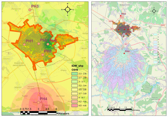 Figure 3 shows two case studies regarding the spatial distribution of benzene in the Ploieşti area. The first one presents the interpolation of the multiannual average concentrations showing that the southern area is more affected by the benzene presence. However, the entire area is experiencing similar concentrations. The second case study highlights the HYSPLIT dispersion results for the highest concentration of benzene (190.29 µg/m3) recorded on 29 July 2021 (4:00 a.m.) at the PH-4 station with layers computed every 25 min (3 h). It was noted that the dispersion of pollutants had an elliptic form oriented toward the south that did not affect the city. This was confirmed by the data recorded from the remaining stations, which showed usual values from 4:00 a.m. to 12 a.m. (at 12:00 a.m., the concentration at PH-4 reached 2.06 µg/m3) (Figure 4).