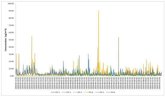Regarding the spatial variation, the lowest multiannual average was in the east of the city 2.34 µg/m3 (PH-6 station), while the highest was reached in Brazi, at the PH-4 station that is located at 11 km in the south of Ploieşti (4.64 µg/m3). Interestingly, the other remaining stations had similar multiannual average values (3.4–3.6 µg/m3) suggesting similar conditions of dispersion due to local topography and meteorology (plain and wind regime).