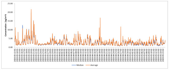 Figure 5 shows the time series of benzene concentrations recorded at the stations during the lockdown and the median and average of all of them. A drop in concentrations was observed starting from 23 March up to 28 March 2020. Then, other periods with reduced concentrations occurred between 5 April and 7 April, and between 13 May and 15 May. The dates coincide with Decrees and Military Ordinances that imposed more exigent restrictions on mobility (see [26] for detailed timelines and descriptions).