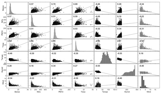 Figure 6 describes the correlations between benzene and other pollutants such as NOx (r = 0.57), particulate matter PM10 fraction (r = 0.70), toluene (r = 0.69), benzene and temperature (r = –0.46), humidity (r = 0.28), and wind speed (r = –0.34). Negative correlations (p > 0.01) were found between benzene and temperature and wind speed, respectively.