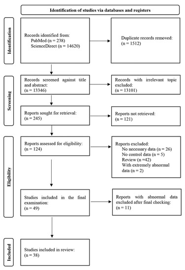 The PRISMA flow diagram of the literature search and study identification, screening, eligibility, inclusion, and exclusion is presented in Figure 1. The diagram includes combined literature data for hair, whole blood, and urine. The agreement specified that the two most relevant databases, PubMed and ScienceDirect, would be searched. Our initial search resulted in 14,858 records. After removing 1512 duplicates, we selected 13,346 reports against the title and abstract. After this, we excluded 13,101 reports with irrelevant topics. The remaining 245 reports were sought for retrieval. Altogether, 121 reports were not retrieved, and the remaining 124 reports were evaluated for eligibility. From these 124 reports, 26 without necessary data, 5 reports without control data, 42 review reports, and 2 reports with extremely abnormal data were all excluded (total excluded, n = 75 reports). The final examination included 49 studies. After an additional check, we excluded 11 of these studies with abnormal data. Finally, our meta-analysis included 38 studies. From these studies, 17 studies considered Pb levels in hair, 13 in whole blood, and 8 in urine. The time frame included studies from 2005–2023 for hair, 2010–2023 for whole blood, and 2010–2020 for urine Pb levels. The total number of control participants was 1883, while the total number of cases was 2043.