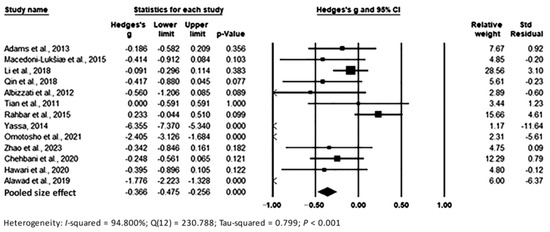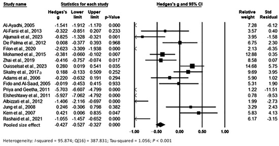 Pooling data under the random-effects model showed significant differences between the two groups (cases and controls), with Hedges’s g = −0.427 (95% CI: −0.527, −0.327) and p < 0.001, with the effect size in individual studies ranging from −5.927 (95% CI: −7.062, −4.792, p < 0.001) [57] to 0.421 (95% CI: 0.006, 0.835, p < 0.001) [60] (Figure 2). Relative weights and standard residuals for each study are shown in Figure 2. Relative weights ranged from 0.78% [57] to 14.68% [52]. Standard residuals ranged from −11.51 [56] to 5.75 [52]. Heterogeneity was I2 = 95.874%, Q16 = 387.831, and τ2 = 1.056, p < 0.001, indicating high heterogeneity between the true mean effects.