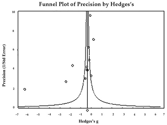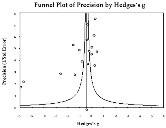 Funnel plot for assessment of publication bias in observational studies comparing whole blood Pb levels of controls and cases. The figure shows the studies’ effect sizes (Hedges’s g) relative to their precision (inverse of SE). Circles represent observed studies. Based on the observed studies, the diamond symbol indicates the pooled overall effect size. Publication Bias—Egger’s regression test: t13 = 3.040, p = 0.011. Begg and Mazumdar rank correlation: Kendall’s τ = −0.461, p = 0.033.