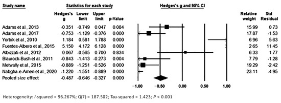 The pooling of data under the random-effects model is presented in Figure 6. The results show significant differences between the two groups, with Hedges’s g = −0.487 (95% CI: −0.646, −0.327) and p < 0.001, with effect sizes in individual studies ranging from -1.220 (95% CI: −1.551, −0.899, p < 0.001) [36] to 5.150 (95% CI: 4.172, 6.128, p < 0.001) [24]. Relative weights and standard residuals for each study are shown in Figure 6. Relative weights ranged from 1.98% [24] to 23.11% [36]. Standard residuals ranged from −4.95 [36] to 11.45 [24]. Heterogeneity was I2 = 96.267%, Q7 = 187.502, and τ2 = 1.423, p < 0.001, indicating high heterogeneity, which was higher than that found in hair and in whole blood.