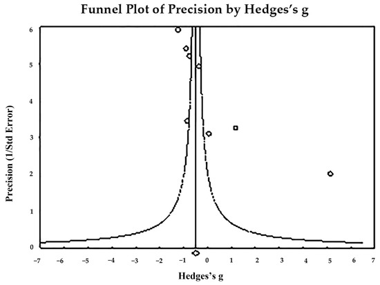 Funnel plot for assessment of publication bias in observational studies comparing urine Pb levels of controls and cases. The figure shows the studies’ effect sizes (Hedges’s g) relative to their precision (inverse of SE). Circles represent observed studies. Based on the observed studies, the diamond symbol indicates the pooled overall effect size. Publication Bias—Egger’s regression test: t8 = 4.225, p = 0.0056. Begg and Mazumdar Rank Correlation—Kendall’s τ = −0.857, p = 0.003.