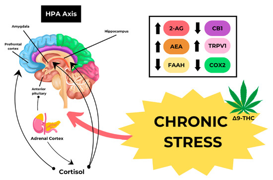 Based on the pharmacological effects, ∆9-THC has neurobehavioral effects mediated by the activation of cannabinoid receptor type 1 (CB1) in the Central Nervous System (CNS). A G protein-linked receptor, CB1, plays a role in several physiological processes, such as appetite, pain perception, mood, and memory [22]. Observational studies indicated that recreational cannabis use may lead to acute poisonings, neurotoxicity, and dangerous outcomes, particularly for children accidentally consuming homemade edibles or concentrated products at home, resulting in intensive care unit admissions and even death, while also being associated with an acceleration of cardiovascular age, irrespective of other factors, suggesting potential adverse effects on the cardiovascular system [23,24,25]. One of the fatal consequences of endocannabinoid system dysregulation is Cannabinoid Hyperemesis Syndrome (CHS). The exact pathophysiological mechanism of CHS is not yet fully understood; however, chronic daily cannabis use has the potential to desensitize or suppress CB1 receptors, which would render cannabinoids ineffective as an antiemetic [26,27]. The development of CHS may be associated with an increase in Transient Receptor Potential Vanilloid 1 (TRPV1) due to chronic stress, as shown in Figure 1.