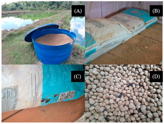During visits to 40 fish farmers, it was possible to verify the storage conditions of the feed, and only one fish farm stored it properly. It was common to observe the storage of feed outside the bags; the feeds were stored in polyethylene water tanks very close to the fishpond’s water (Figure 1A). In some fish farms, feed bags were observed under the floor of the sheds without any protection against humidity (Figure 1B). Most of the time, the feed bags were stored inside small, covered rooms, although they were subject to contact with rats, cockroaches and woodworms, in addition to conditions of humidity and high temperatures (Figure 1C,D).