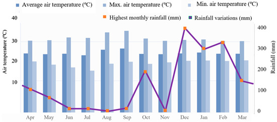 The average air temperature, during the coldest month, exceeded 18 °C (megathermal), and a well-defined dry season occurs when there is a moderate water deficit with rainfall indices below 50 mm month−1. The average annual rainfall varied between 1400 and 2600 mm year−1, while the monthly average air temperature varied between 24 and 26 °C (Figure 2). Regarding meteorological data, the months of October 2021 (200 mm), December 2021 (189.50 mm), January 2022 (336.05 mm) and February 2022 (359.66 mm), showed the highest precipitation averages. While the months of August and September 2021 showed the highest average temperatures, >35 °C, respectively. There were no significant variations in the other months (Figure 2).