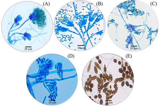 Photomicrographs of free-living fungi: Aspergillus fumigatus (A), Penicillium citrinum (B), Penicillium implicatum (C), Fusarium oxysporum (D) and Alternaria alternata (E).
