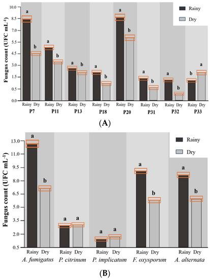 Abundance of free-living fungi per fish farm freshwater (A) and per species of fungi (B) in rainy and dry seasons. Subtitle: If there are different letters at the top of the fungus count columns, there is a statistical difference according to the Student’s t-test (p < 0.05).