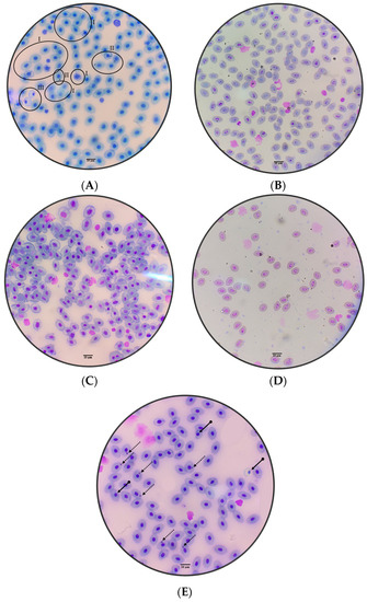 Immediately after capture, the animals were immobilized using their hands and nitrile gloves, and, in a tray moistened with water, 10 μL of peripheral blood was collected by puncturing the tail vein (at 45° on its ventral side). The blood was dripped directly onto the slides, and the smears were performed in duplicate for each animal. Immediately after blood collection, the animals were returned to their cages. The biological material was sent to the laboratory for a period of 12 h at room temperature. Then, the slides were hydrated for 5 min in distilled water and subsequently stained with the Quick Panotic LB kit. This kit is composed of three containers: Triarylmethane (0.1%), Xanthenes (0.1%) and Thiazines (0.1%). The slides were immersed 30 times in each container with submersion for one second in the sequence described above, according to Meneguetti et al. [26]. Subsequently, the slides were washed in deionized water at pH 7.0 and dried at room temperature, as described by Meneguetti et al. [26].