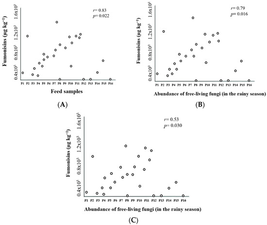 Pearson’s correlation analyzes the relationship between fish farm feed samples and Fumonisins (A), the abundance of free-living fungi in the rainy season and Fumonisins (B), and this same correlation in the dry season (C).