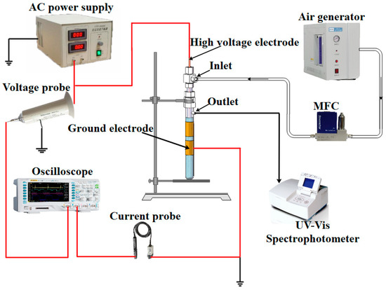 The gas–liquid hybrid double dielectric barrier discharge (DDBD) reactor used in this study was the same as in our previous work [17]. A copper rod (8 mm in diameter and 220 mm in length) was used as the high-voltage electrode. Two quartz tubes were used as the insulating medium, with a gap of 1 mm. The inner one, with an inner diameter of 9 mm and an outer diameter of 12 mm, was covered outside the copper rod electrode, and the gap between them was 1.5 mm. The inner and outer diameter of the outer quartz tube were 18 mm and 20 mm, respectively. Four identical copper strips connected in series with a total length of 80 mm, which were attached tightly to the outside surface of the outer quartz tube, were used as the grounding electrode. The DDBD plasma reactor was supplied by a high-frequency AC power supply (CTP-2000K, Nanjing Suman Electronics Co., Ltd., Nanjing, China). The voltage frequency was 10.13 kHz. A high-voltage probe (Tektronix P6015A, Cincinnati, OH, USA) and a voltage probe (Rigol PVP2150, Suzhou, China) were employed to record the voltage and current delivered to the reactor. The schematic diagram of the experimental setup is shown in Figure 1.