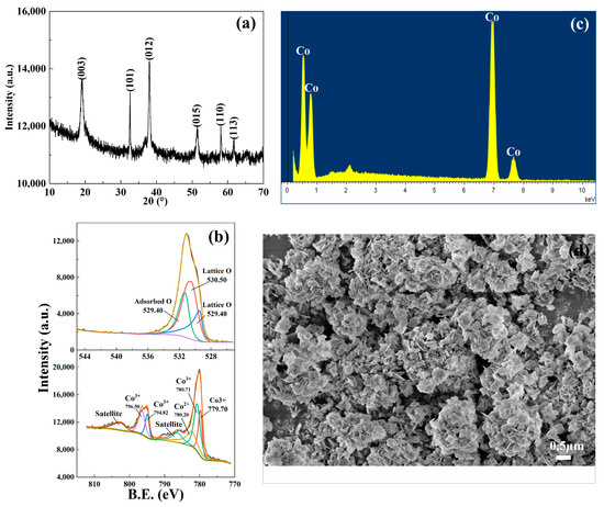 XPS was employed to analyze the valence distribution of each element in the catalyst. In Figure 2b, the peaks at 529.40 eV and 530.5 eV represent oxygen atoms within the lattice of the substance [22,23], and the peak at 531.28 eV indicates oxygen atoms from ·OH adsorbed on the surface of the measured substance [24,25,26,27]. It is calculated that the lattice oxygen atoms account for 33.28% of the total number of atoms, and the oxygen atoms from the adsorbed ·OH account for 13.39% of the total. This ratio is consistent with the expected proportion of lattice oxygen atoms and adsorbed oxygen atoms in CoOOH. Additionally, the XPS energy spectrum of Co2p was analyzed. The peaks of Co3+ appeared at 779.70 eV, 780.71 eV, 794.82 eV, and 796.50 eV, and the peak of Co2+ appeared at 782.20 eV [27,28]. Additionally, EDS was utilized to detect the catalyst, enabling the quantitative analysis of each element. As depicted in Figure 2c, distinct characteristic peaks of Co and O are detected, with a molecular ratio of approximately 36.52% for Co and 63.48% for O, which closely matches the theoretical ratio for CoOOH. Consequently, there is strong evidence supporting the identification of the catalyst as CoOOH.