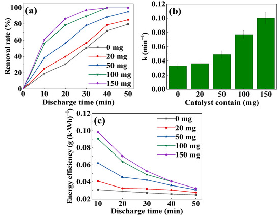From Figure 3c, it can be observed that the energy efficiency gradually increases with the increase in CoOOH dosage after the same discharge treatment time, while decreases as the discharge time prolongs. Without CoOOH, the energy efficiency was only 0.03 g (k·Wh)−1 after 10 min, and it decreased slowly with time. However, when 100 mg and 150 mg of CoOOH were added, respectively, the energy efficiency reached 0.09 g (k·Wh)−1 and 0.1 g (k·Wh)−1, respectively, which were 2.90 times and 3.19 times of that without CoOOH. Additionally, the energy efficiency decreased significantly as the discharge time extended.