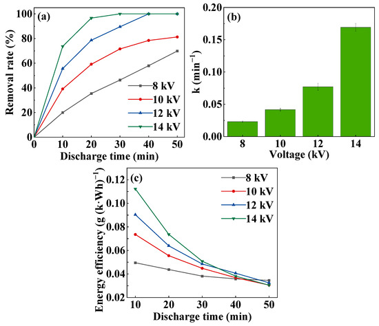 MB degradation under different discharge voltages: (a) removal rate, (b) first-order reaction rate constant, (c) energy efficiency (the dosage of CoOOH was 100 mg).