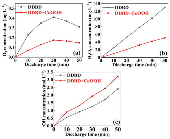 In order to explore the mechanism of the synergistic effect between the DDBD and CoOOH, the content of active substances (H2O2, O3, ·OH) at different discharge times was detected. As shown in Figure 6a, in both systems, the O3 content initially increased and then decreased. It was due to the fact that in the discharge process, the air passed through the gas phase discharge region and produced active substances such as high-energy electrons and O3, and then these active substances entered the liquid phase with air to form e(aq) and O3(aq), as shown in Formulas (1)–(3). Therefore, at the beginning of the discharge, the O3 concentration in the solution gradually accumulated and increased with the extension in the discharge time. Until 30 min, the O3 concentration reached the maximum, 0.41 mg L−1 and 0.19 mg L−1 in both systems, respectively. However, after 30 min, the O3 content gradually decreased over time. In several studies, there was also an inflection point in the variation of dissolved O3 concentration with treatment time with a high-frequency power supply. It was due to the fact that the electrical discharge could heat up the temperature of the solution in these cases, which was adverse to the dissolution of O3 in water [5]. In contrast, it can be seen from Figure 6b,c that the H2O2 and ·OH contents continuously increased as the discharge time prolonged. This was mainly because the active substances dissolved in the solution underwent a series of oxidation reactions in the liquid phase to form H2O2 and ·OH, as shown in Formulas (4) and (5), and then these active substances (H2O2, ·OH) were gradually accumulated with the extension in time [34].