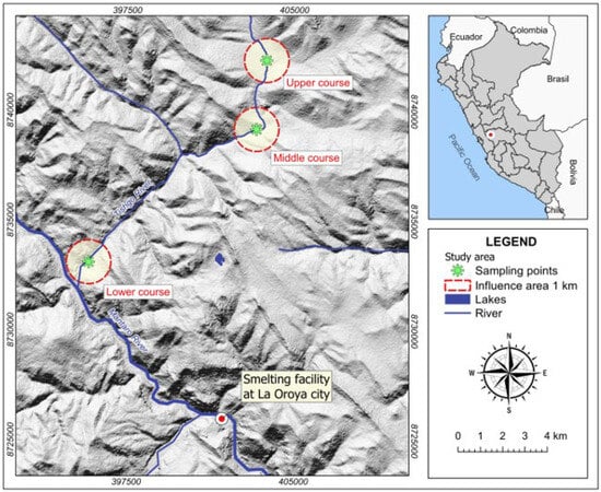 Specifically, the concentrations of Pb were found to be 47.68 mg/Kg in the upper part and 36.62 mg/Kg in the lower part, both of which significantly exceeded (p < 0.05) the permissible maximum limit of 35 mg/Kg. Additionally, for Zn and As, the values measured in the river significantly exceeded the permissible maximums at all sampling points (p < 0.05), with maximum values found to be 231 and 42.44 mg/Kg, respectively, which can be attributed to metallurgical operations involving polymetallic concentrates since the smelting plant consisted of three production circuits for copper, lead, and zinc. Copper production began in 1992, lead in 1928, and zinc in 1952 [,], and these processes typically involved smelting and refining. This was especially true for copper, where mixtures of recycled material, fluxes, and concentrates were prepared, and refining involved roasting the mixtures to remove impurities such as arsenic, sulfur, antimony, and lead [,], which resulted in slag. Studies elsewhere report that arsenic concentrations were measured from 1070 ppm in roasted slag piles to 2960 ppm in mine tailings and 10,400 ppm in smelting residues. It was concluded that these contaminants increased according to the degree of processing [], which contains traces of lead and arsenic []. These aspects emphasize the importance of proper mine waste management, as improper disposal of mine waste materials from these activities can result in the release of Pb into the environment, leading to its deposition in the sediment []. This was the case in La Oroya city, where a report prepared by the United States Government’s Agency for International Development, Peru Mission, revealed that the large slag hills in La Oroya city were evidence of an accumulation of Pb [], which remains apparent to this day.