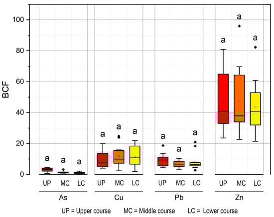Kruskal–Wallis analysis indicated that there were no significant differences (p > 0.05) in the bioconcentration factor (BCF) values among the sampling points for each evaluated element (Figure 2; Table S1). The highest values in the distribution of BCF in the upper, middle, and lower courses were observed for Zn (with medians of 40.57%, 37.90%, and 40.87%, respectively), followed by Cu (with medians of 10.77%, 9.97%, and 7.55%, respectively), Pb (with medians of 6.42%, 6.67%, and 9.35%, respectively), and As (with medians of 1.12%, 1.44%, and 3.29%, respectively).