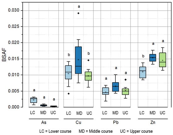 Distribution of biosediment accumulation factor (BSAF) of heavy metals and arsenic (letters “a” and “b” mean that all the sectors are significantly different, p < 0.05).