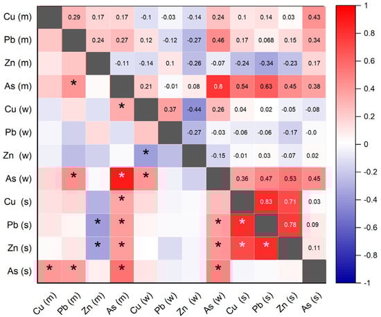 The Spearman correlation coefficient between heavy metals and arsenic of rainbow trout muscle (m), water (w), and sediments (s) (* significant correlation, p < 0.05; blue color gradient, negative correlation; and red color gradient, positive correlation according to Spearman).