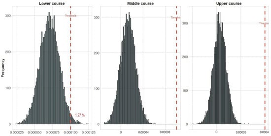 In the lower sector, there was a risk probability of 1.27% found for the exceedance of the established threshold. However, in the middle and upper sectors, there were no significant risks identified. These results highlight the importance of the Monte Carlo analysis as an effective tool for assessing health risks in cases of exposure to heavy metals (Figure 5).